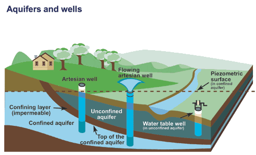 Aquifers are bodies/deposits of water trapped under soil layers; the existence of these has resulted in settlements appearing where no obvious water sources are; Las Vegas sustains itself despite the dry surface due to the aquifers beneath it – courtesy of USGS