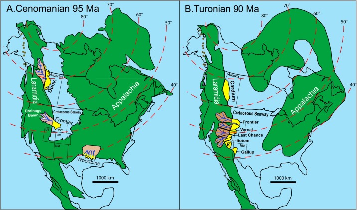 The Western Interior Seaway at points was blocked from the Gulf of Mexico, or even connected to now-gone water routes to places in modern Quebec and Greenland; the WIS’ existence meant the western and eastern portions of North America were, respectively, Laramidia and Appalachia – courtesy of ScienceDirect
