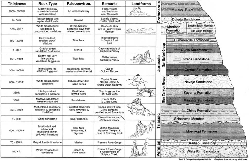 - “Geology of Capitol Reef National Park”. USGS. https://www.usgs.gov/geology-and-ecology-of-national-parks/geology-capitol-reef-national-park#:~:text=Capitol%20Reef’s%20geology%20can%20be,level%20on%20the%20stratigraphic%20column.