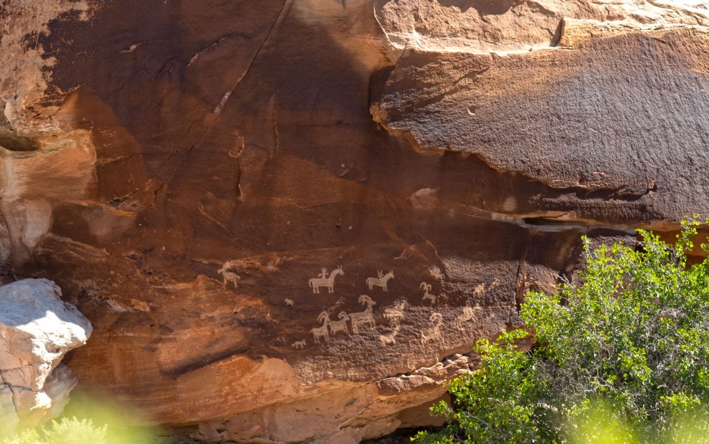 As you start off you will notice a trail on the left side that leads to petroglyphs (it is also possible to do this on the return trip). These rock art pictures are thought to be drawn by the Ute people. Most archaeologists agree that it depicts a hunting scene. There are riders on horseback, bighorn sheep, and smaller creatures that appear to be dogs.