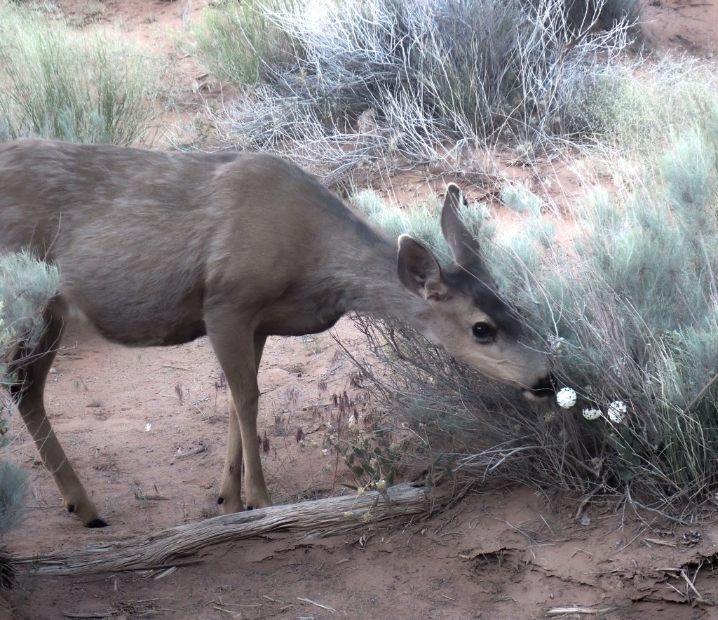 Using the 6:00 am timed entry ticket in May 2022 and driving directly to Devil’s Garden, we were able to observe a herd of Mule Deer grazing near Pine Tree Arch. These were captured using a long lens. Please respect the space and privacy of all wildlife!