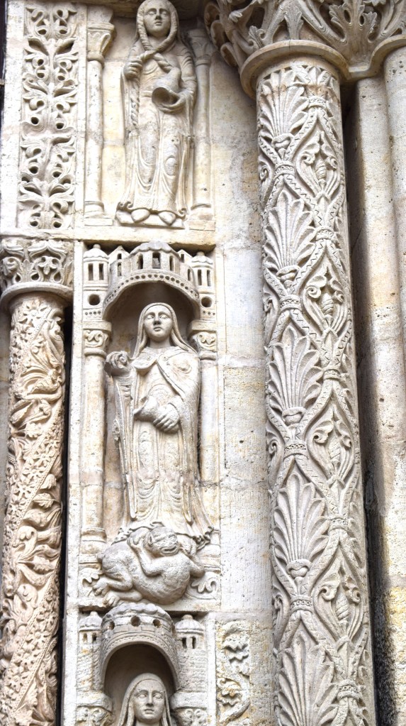 Dedicated in 1140, the entrance’s 3 sections (the center the largest) are each bestowed their own door. Above the doors is a 3 story elevation. Where two towers also stood above the doors, the North tower was destroyed in an 1846 tornado (Europe gets them too, most often in northwestern Germany), leaving only the South Tower standing today. Above the center door is a Gothic feature imitated throughout the area (including Chartres): a central rose window within a square structure.