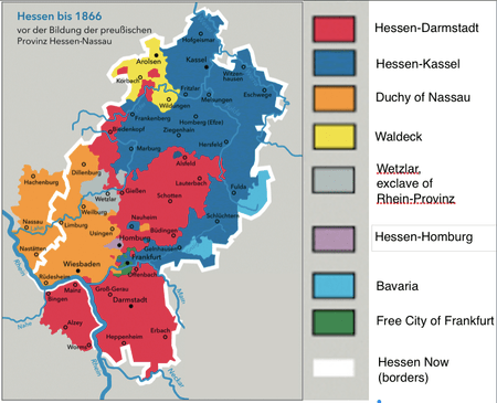Hesse modern borders and borders circa 1866; many other German lands were as scrambled as this until Prussia maneuvered them into unity, minus the Hapsburg-ruled Austria; note Bavarian territory; Bavaria to this day isn’t that tiny, it’s that these were pockets owned by the kingdom; other German principalities were core zones and their far-afield enclaves – courtesy of FamilySearch