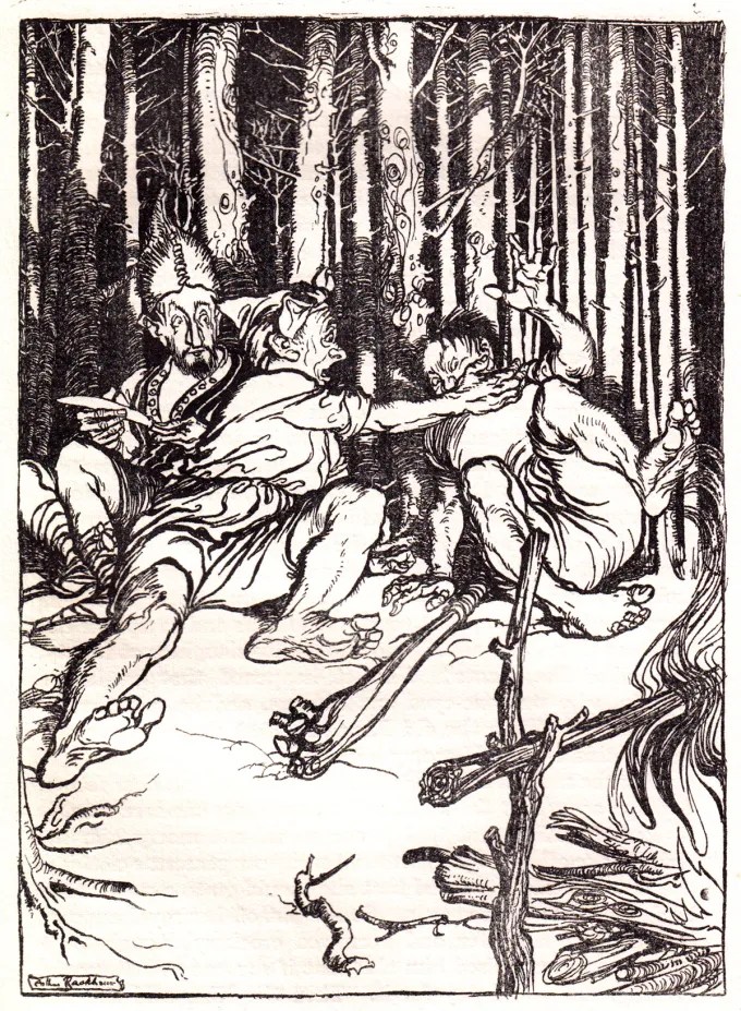 Arthur Rackham illustrational accompaniment to a Brothers Grimm fairy tales edition; deliberate or not, Rackham conveys the fascination with and apprehension to forests in German lands – courtesy of The Marginalian