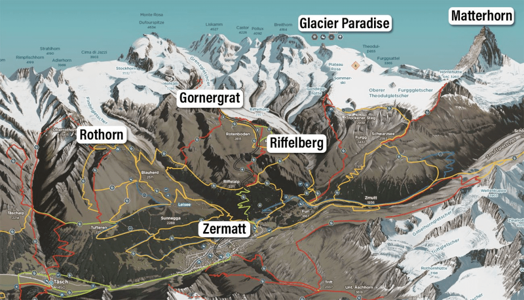 Gornergrat- there is a hotel, dining, shopping, observatory, viewing platforms. Trailheads are located as well.