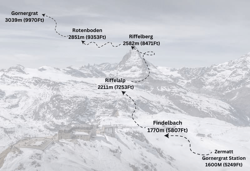The Gornergrat Bahn (Bahnhofpl. 1, 3920 Zermatt, Switzerland) is almost next to the Zermatt Train station where you arrived and a short way up from the Sunnegga Funicular on the same road. Facing the Zermatt Train Station- look to your left and you will see the railway on the corner. From Sunnegga- facing the entrance- turn right and keep walking up the street.
