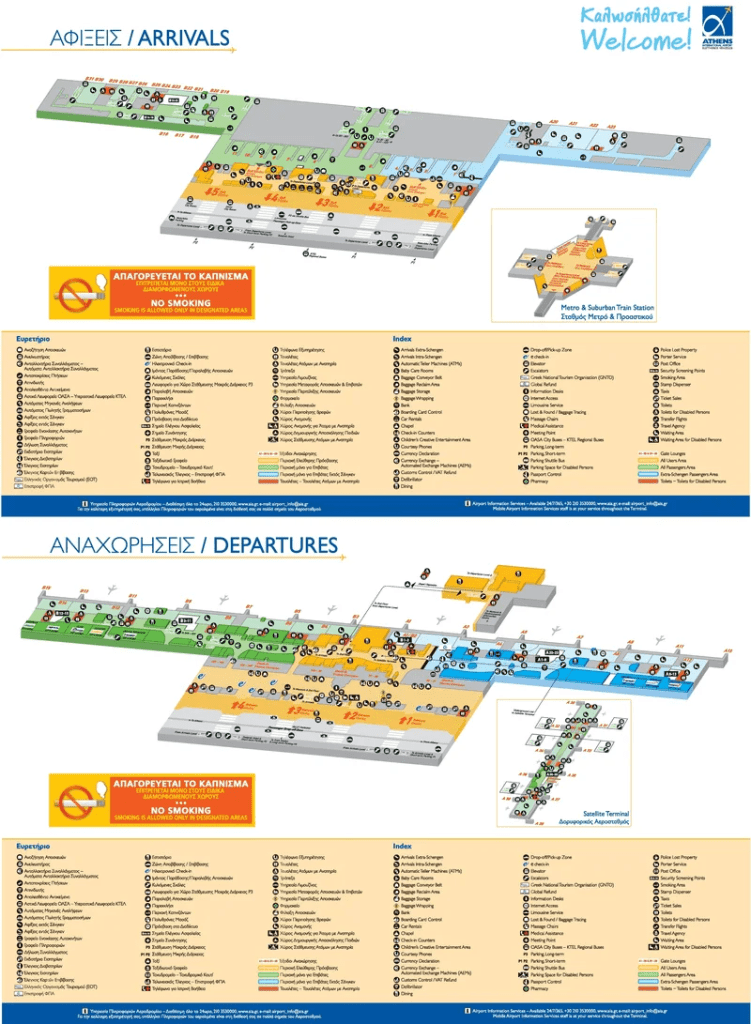 Eleftherios Venizelos, https://www.aia.gr/en, is the international airport in Athens, Greece. If you are arriving in Greece or flying to one of the Greek Islands- this is most likely the airport you will use. It is important to know that not every plane has a direct plane access boarding gate. Many flights will park somewhere on the airfield and buses are used to transport passengers to/from the main terminal. First class passengers often have their own bus. If you need special assistance it is critical that you arrange this in advance. The walk from international arrivals to passport control is LONG. Restrooms are available along the route. Passport Control was well organized and straightforward. Watch for your lane- EU or NonEU, get in the lane and follow it to the passport officer’s kiosk where he will look at you and then stamp your passport and then you exit. This is the CURRENT procedure- the upcoming Schengen visas, and fingerprints will have an impact. Once you are clear of passport, you will walk a distance to baggage claim. Just look at the overhead monitor, locate your flight (information will be Greek, wait a few seconds and it will switch to English) and go to that baggage terminal. Once you collect your bags you enter the Arrivals Hall where a sea of people will be holding up name placards- these are for tour groups, private transfers, etc. You can find rental car services, connections to the metro station and public taxis.