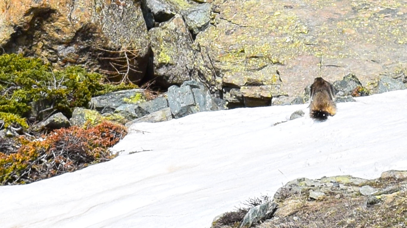 From the lake, cross back to the main trail road junction and follow the signs down to Sunnegga. The trip will take you past several alpine lakes and beautiful scenery. Look our for the Marmot which has its habit in the region. There is a marmot “playground” trail right off the Sunnegga Funicular stop. As you can see from the above section pictures- the marmot blends in well with the environment- we were simply lucky to catch him crossing the snow.