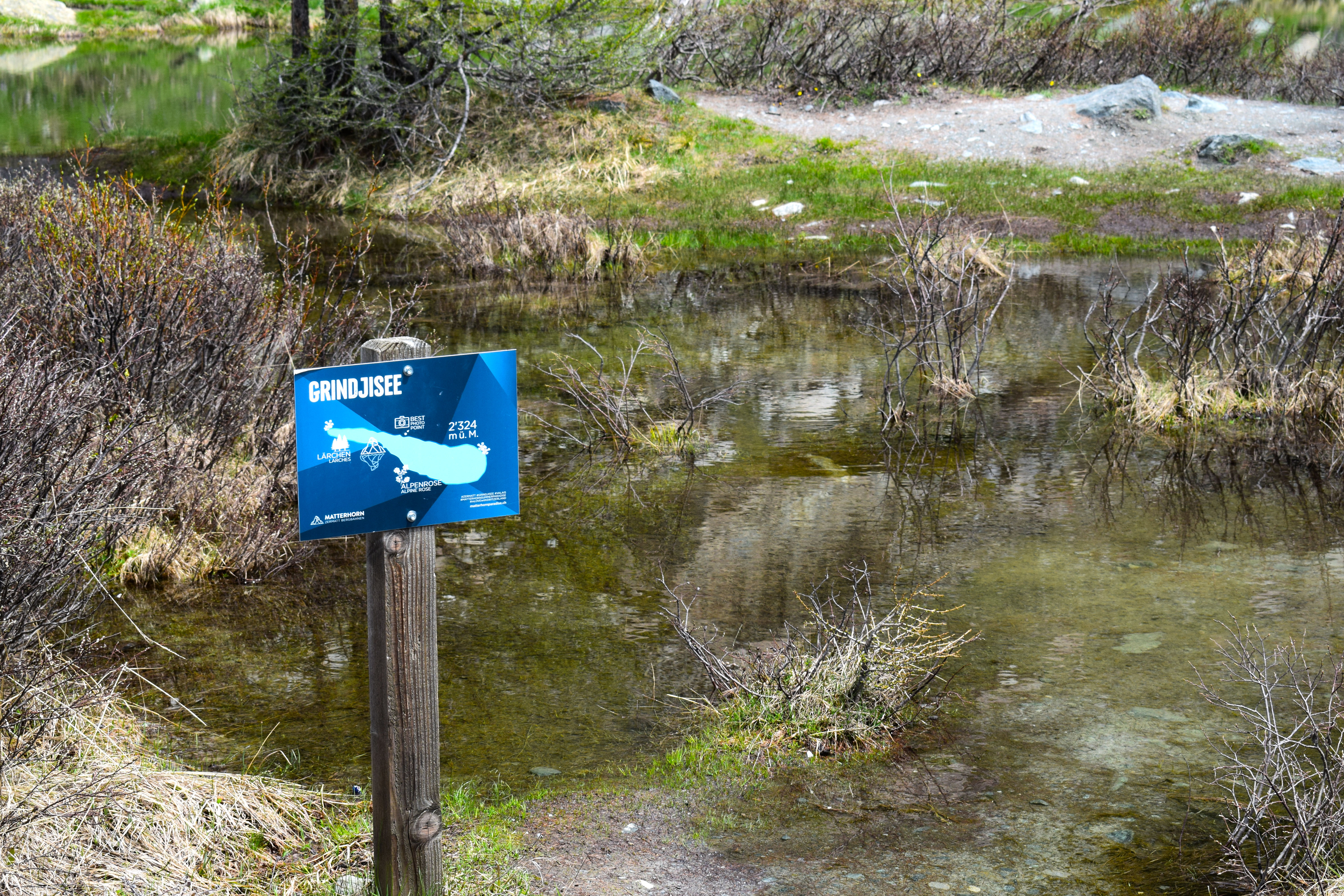 We ended up going up the road that the mountain bike carts come down. Once we reached the Blauherd cable car station which was being tuned up for opening the following week, we sloshed through muddy snow to find the path (just follow the sign posts) towards Lake Stelliswee. The trail is an up and down. Just follow the well defined road and eventually you will see it emerge on your left. The lake is not that big so you can hike 365 degrees. The highlight of course is at the end opposite the Matterhorn where the reflection can be caught. For us, the lake was still partially frozen, but we were still able to capture a good image. This area can get crowded so be patient. If you try to cut over the grasses to the part of the lake that is opposite the Matterhorn and there is snow on that section- beware- you might be stepping into 3-4 feet of soft snow. There are fish in the lake.