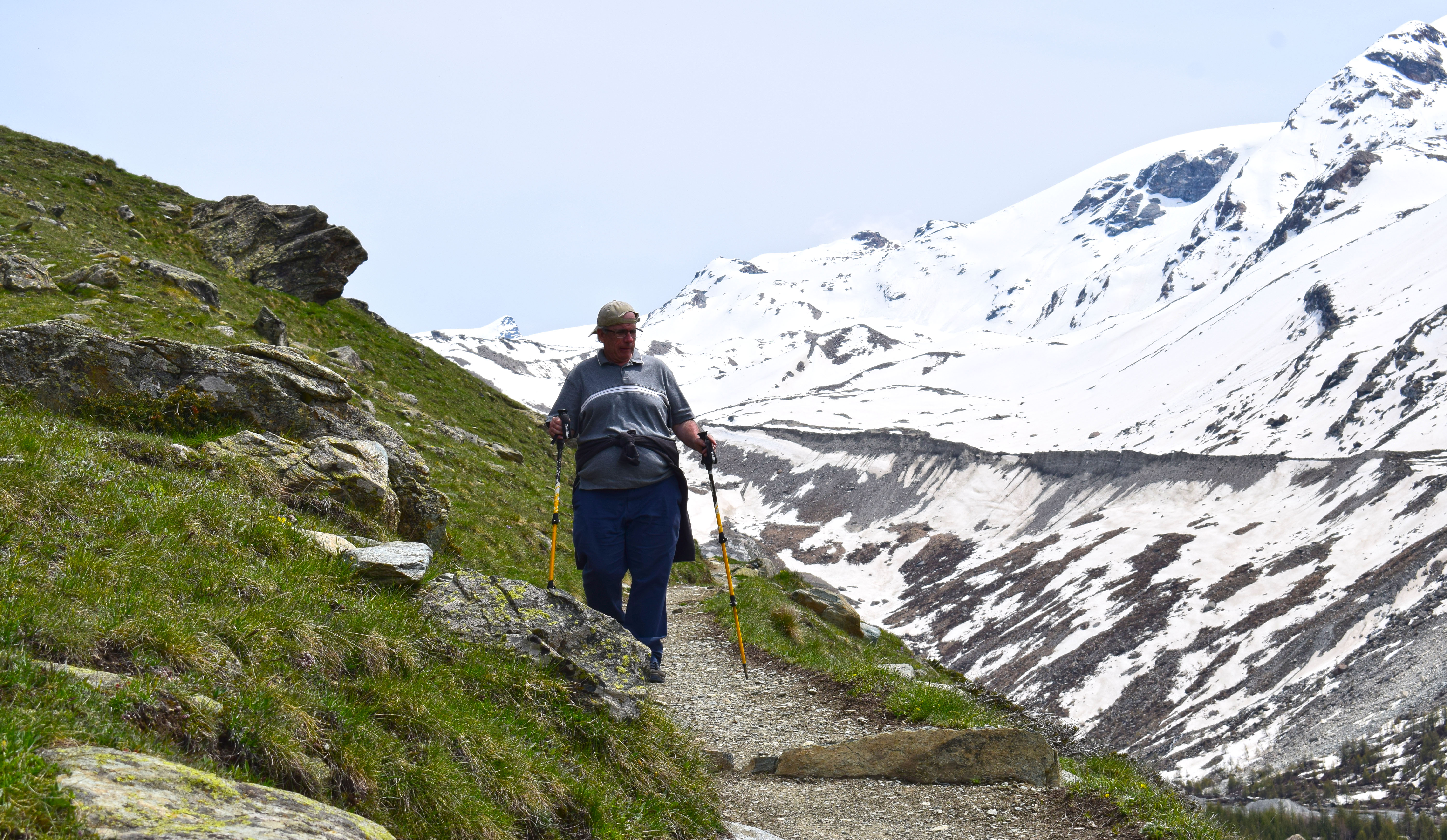 Most people board the cable car at Sunnegga to travel here to hike to Lake Stelliswee. It is closed in the shoulder season as is the next station Rothborn. Blauherd doesn’t open until June 15th or thereabouts. So we decided to hike to Blauherd and onto Stelliswee. Fortunately, for us, while the trails were muddy in spots, snow was limited on the trail. There were significant snows (about 3-4 feet) around Lake Stelliswee.