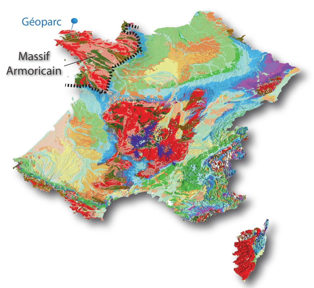Massif Armoricain, west of Paris Basin, itself north of Massif Central, for reference as to modern Loire’s flow route – courtesy of Geopark Armorique
