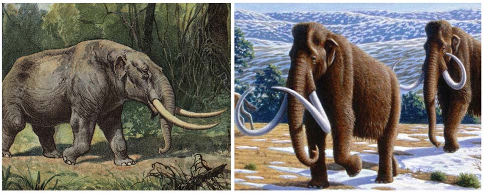 Mastodons (left) had shorter tusks, somewhat-smaller ears, and flatter heads than mammoths (right) – courtesy of National Park Service