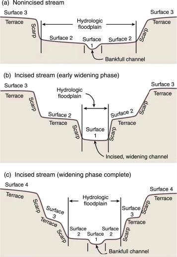 Downcutting is a result of flooding; large amounts of water move through a river channel (large rocks and boulders are carried along with the sediment). The rocks chisel pieces of the riverbed as they flow farther.