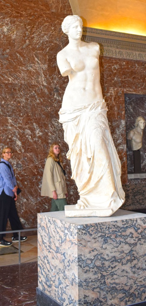 This marble statue takes its name from the Aegean Island (Melos) where it was discovered in 1820. The Louvre claims to have three “great ladies”- the Venus de Milo, The Mona Lisa and the Winged Victory. The statue’s missing arms made identification difficult because arms/hands often featured objects that identified the Greek god. No one really knows who the identity of this lady. She has been thought to be Amphitrite, the queen of the sea as well as Aphrodite, the goddess of beauty, who would have held an apple in her hand.