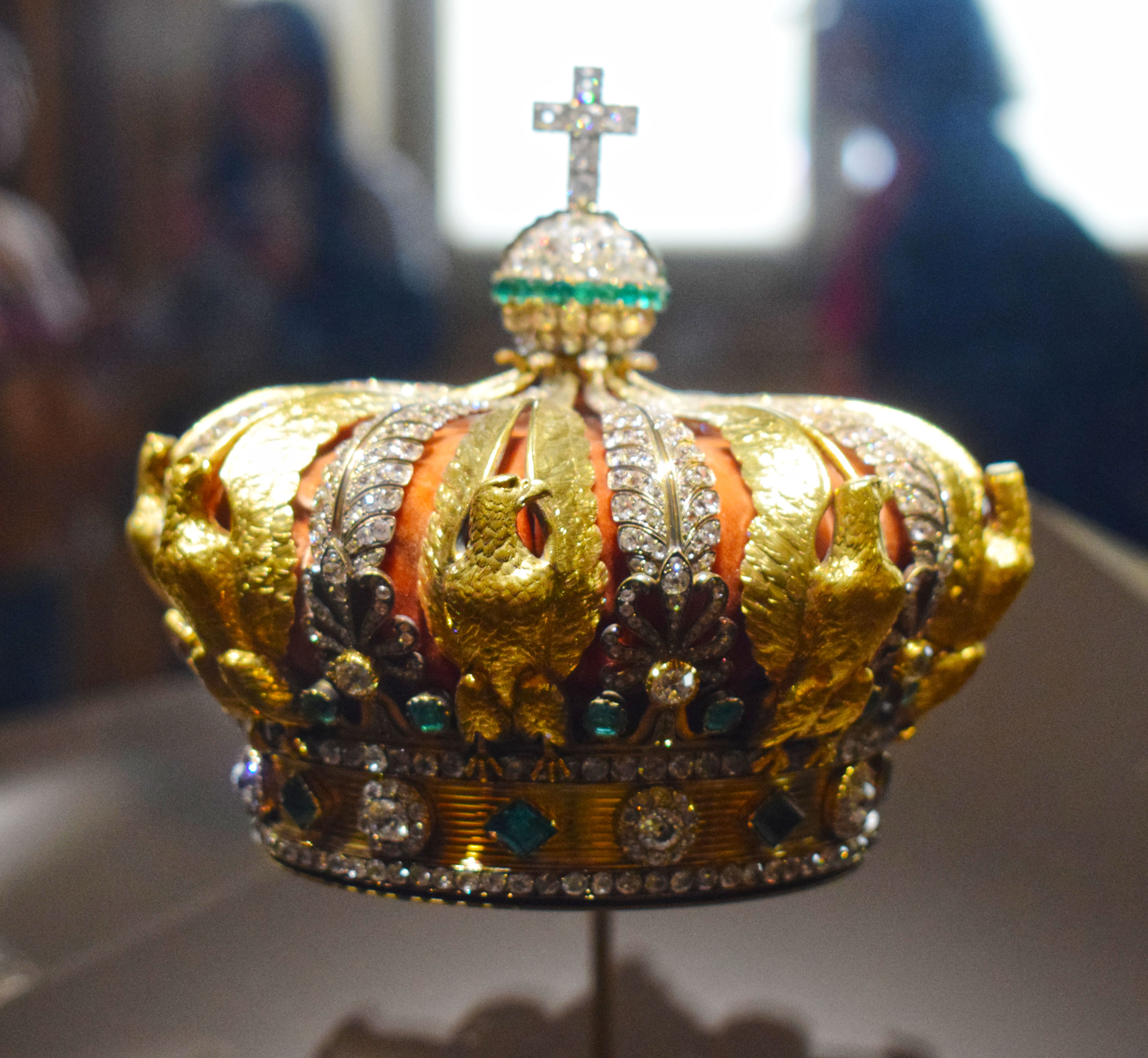 This room was rebuilt by King Louis XIV after it was destroyed by fire. King Louis XIV styled himself as the Sun God and this room reflects this image. He hired painters, gilders, and sculptures to reflect his Sun God image. These same artisans worked on the Hall of Mirrors at Versailles. This room displays some of the crown jewels.