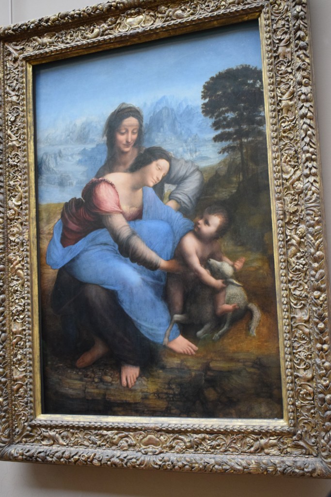 Look for The Virgin and Child with St Anne and a Lamb c. 1508 by Leonard da Vinci features the Virgin Mary seated upon the lap of her mother St. Ann reaching for baby Jesus who is reaching for a lamb. The composition is striking for its use of triangles- the posture of Mary, the hand on hip pose of St. Ann, and Jesus reaching for the Lamb.
