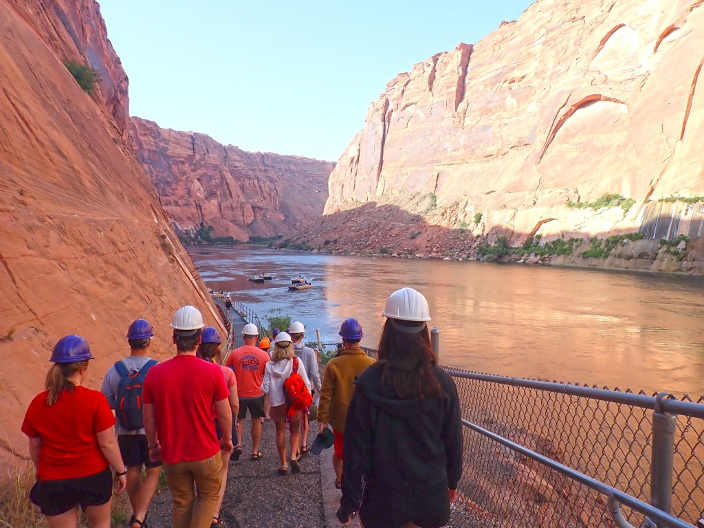 It is a short bus ride to the Glen Canyon Dam where you will enter a tunnel and wind down to water entrance. When the buses arrive you will be handed a hard hat for the short walk down the ramp. The walk is near a cliff so there is the remote possibility a small rock could be dislodged. Once on the raft, you will be given safety instructions and the opportunity to view the dam from the river level- which is really impressive- more so, in my opinion, than the water level view of the Hoover Dam because you are closer to the dam giving it a steep, tall perspective.